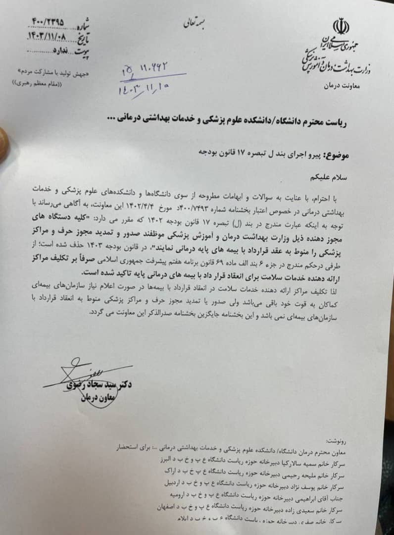 ابلاغیه وزارت بهداشت درباره اجرای بند (ل) تبصره ۱۷ قانون بودجه ۱۴۰۳